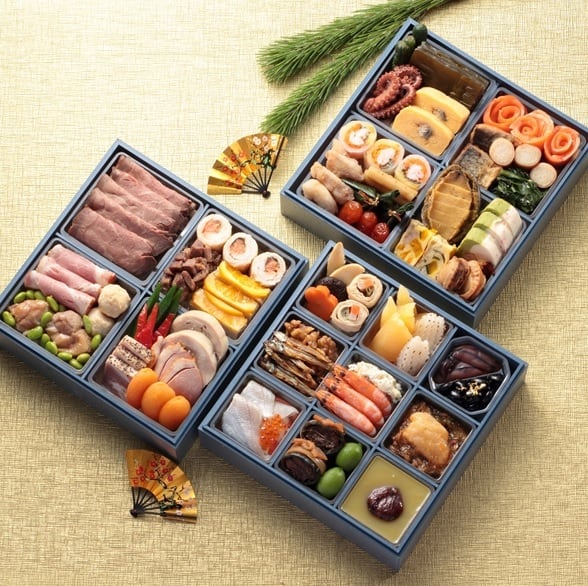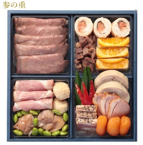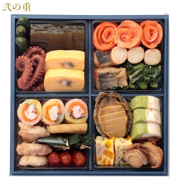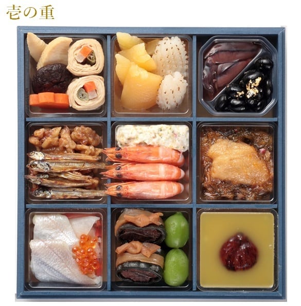 筍旨煮・椎茸旨煮・梅人参煮・湯葉三色巻・数の子・いか松笠白焼・ほたるいか沖漬・黒豆金箔・くるみ甘露煮・田作り・北寄貝サラダ・海老艶煮・するめ松前漬・小鯛柚庵漬・かぶらの甘酢漬・いくら醤油漬・にしん昆布巻・若もも甘露煮・渋皮栗きんとん